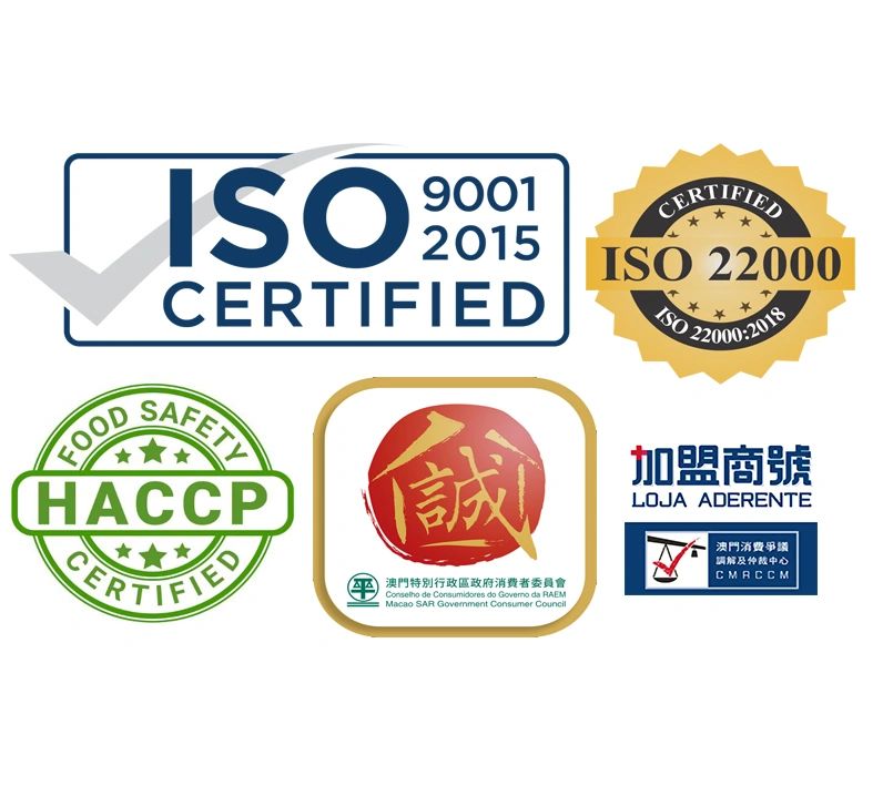 本店的食品工場/製作間巳榮獲ISO 9001證書證明。在食品企業體系、產品質素,以及管理及運作系統化和現代化方面,均達到國際水平